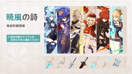 期間中、今期における全★5ラインナップの中から、★5キャラクターまたは★5武器を1つ選んで軌定すると、「暁風の詩」祈願での出現確率をUPできます。