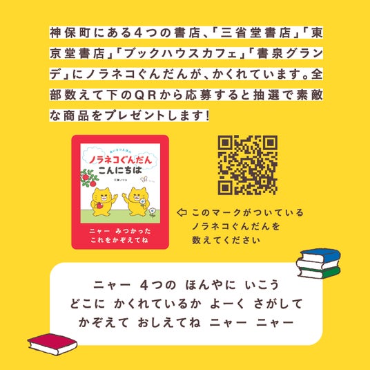 神保町にある個性豊かな4書店(三省堂書店、東京堂書店、ブックハウスカフェ、書泉グランデ)に、“ノラネコぐんだん”が、かくれています。どこにかくれているのか?全部で何匹みつけられるか?を楽しみながら書店巡りをしてもらえるゲームになっています。