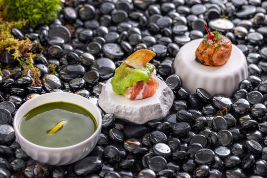 深みのある緑色が特徴的な前菜「抹茶あんの海鮮茶碗蒸し」は、八女抹茶で作った茶碗蒸しの餡に、イカと海老、ニンジンを入れ、抹茶の濃厚な風味を際立てるため、仕上げに柚子をあしらいました。茶碗蒸しの中に配されたニンジンは、蝶の形に象られており、抹茶の深みとともに料理長の遊び心が詰まった一品です。前菜2品目には、白身魚のすり身に、叩いた紅生姜を合わせてタコを包み、タコ焼きに見立てた「変わり揚げ蛸」をご用意しました。フランス料理でよく使用されるフォンドボーを和風にアレンジし、魚をじっくりと煮詰めてマスタードと合わせたソースとともにお召し上がりください。また、グリーンピースを裏ごしし、かつお出汁で風味を付けた甘い餡といただく「揚げ新じゃが生ハム」もご堪能ください。手毬寿司は、草木が茂り美しい花が咲く季節にインスピレーションを受けた、料理長自慢の見た目にも美しい5貫が並びます。