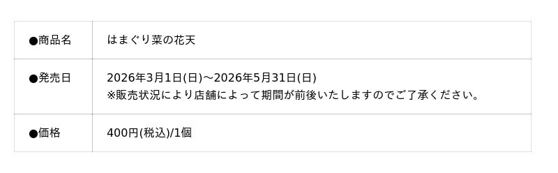 株式会社まる天は2026年3月1日(日)より、春限定商品「はまぐり菜の花天」を期間限定で発売します。旨味あふれる"はまぐり"と旬の"菜の花"を、ふんだんに練り込んだ、旬の味覚を楽しめる逸品です。