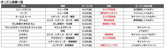 今春は、昨年オープンした「ナイキ」に加え、エリア初出店となる「ニューバランス」や、「プーマ」の国内初コンセプトストアなど、人気海外スポーツブランドが集結する新ゾーンが誕生いたします。また、エリア初出店の「ビームス ハート」、県内初出店の「チャムス」、新業態1号店となる「だし茶漬け 肉そば えん」など、ここでしか出会えない魅力あるブランドが、さらに充実します。そのほか、「マシンピラティススタジオ リントスル」、「トイザらス」、「ビラボン」の増床移転、「オセワヤ」のエリア初出店、「パンジー」、「フランフラン」の改装リニューアルを含む、全11店舗が順次オープンいたします。