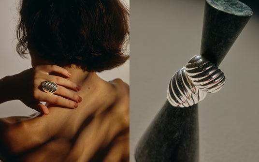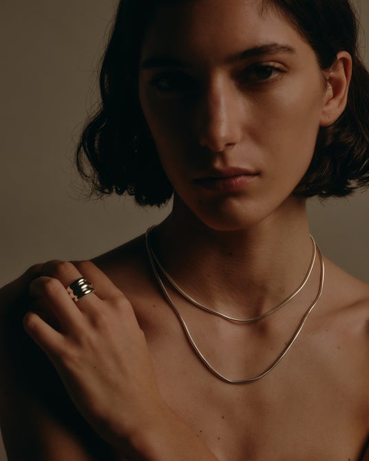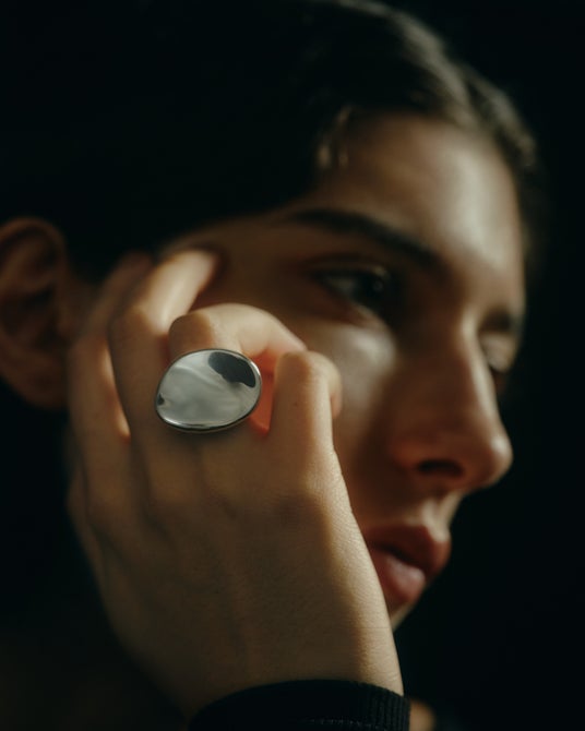 幅広のリングを重ね、構築的な厚みと陰影を堪能するデザインに。