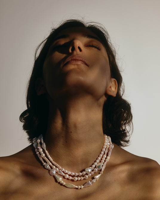 海の恵みを感じさせる淡水パールを自由なリズムで連ね、肩の力を抜いた軽やかな表情を引き出しました。