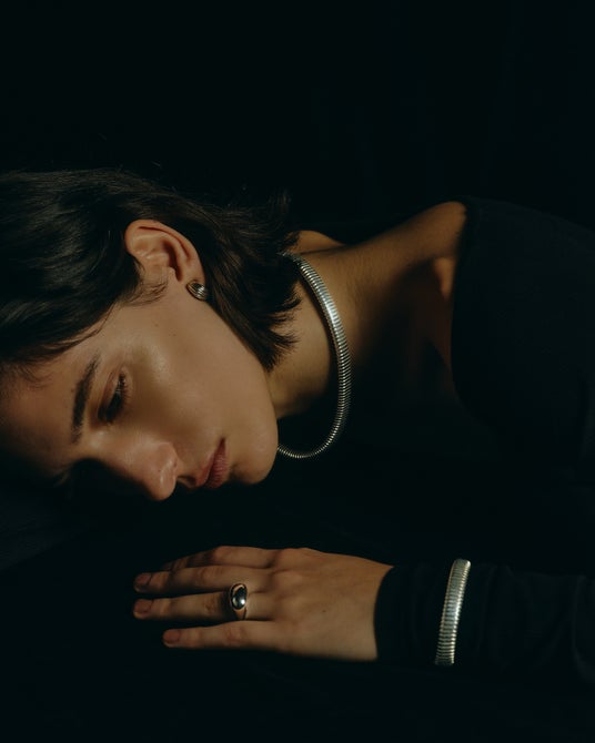 “骨”にインスピレーションを得た重厚な形を、クリーンなシルバーで表現しています。