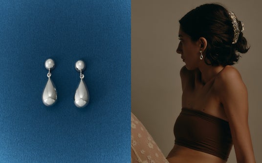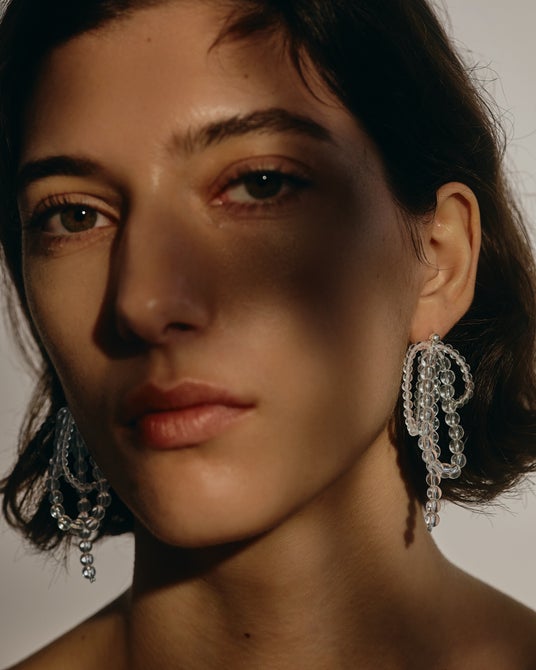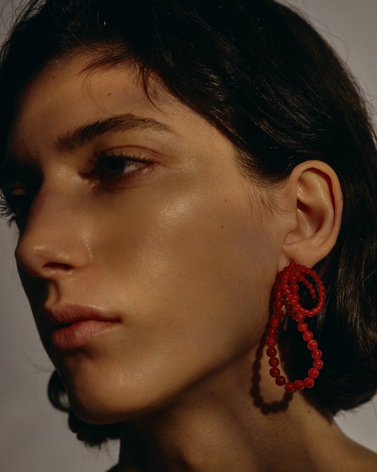 ボリュームを生かし、引き算したメイクアップや耳にかけたダウンヘアと組み合わせて。