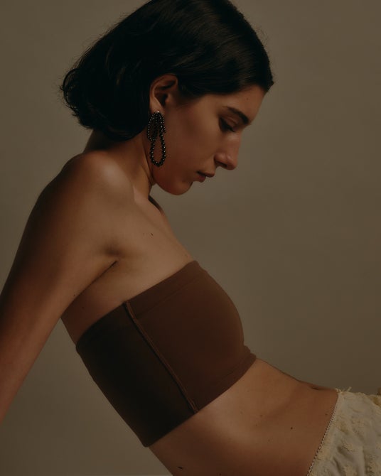 タイトに纏めたヘアスタイルと合わせて、彫刻的な印象を堆能して。