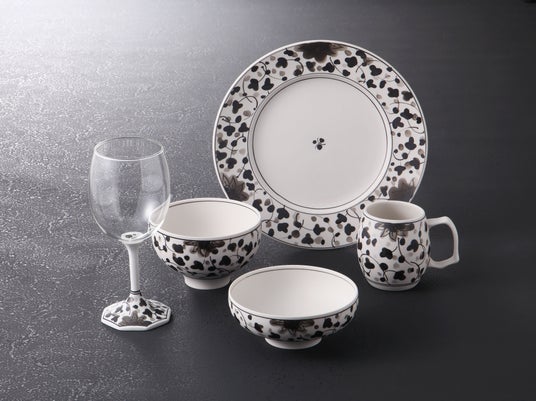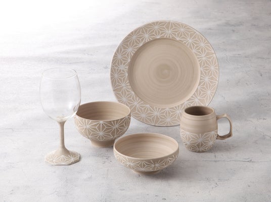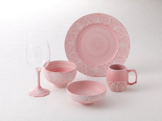 有田焼は通常、釉薬を塗り白くなめらかな質感に仕上げることが特徴ですが、今回はあえて釉薬を塗らず、「珪」独特のざらっとした質感を楽しめる製品となっています。各アイテム、麻乃葉模様、若葉模様、手描墨絵唐草模様の3デザイン展開となります。(5アイテム×3デザイン、全15種)