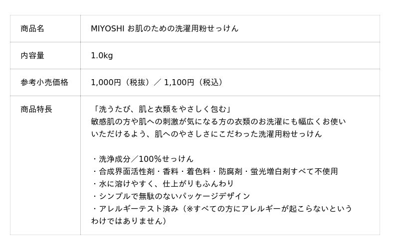 このたび、生活者の“敏感肌”に対するケア意識の高まりや、肌にも環境にもやさしいプロダクトを求める生活者ニーズの高まりを背景に、肌へのやさしさを追求した洗濯用粉せっけんの新製品「MIYOSHI お肌のための洗濯用粉せっけん」を新発売いたします。洗浄成分には100%せっけんを使用し、合成界面活性剤・香料・着色料・防腐剤・蛍光増白剤はすべて不使用。敏感肌の方や肌への刺激が気になる方の衣類のお洗濯にも、幅広くお使いいただけます。また、本商品はアレルギーテスト済みです。(※すべての方にアレルギーが起こらないというわけではありません)