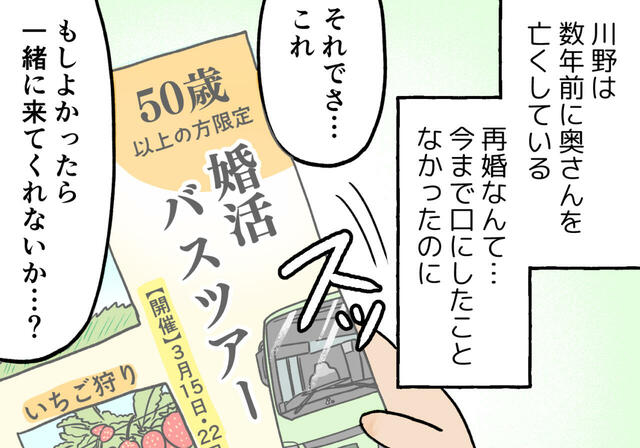 同僚・川野の切実な思いに心を動かされた直也は、彼のサポート役として婚活ツアーに参加することに。