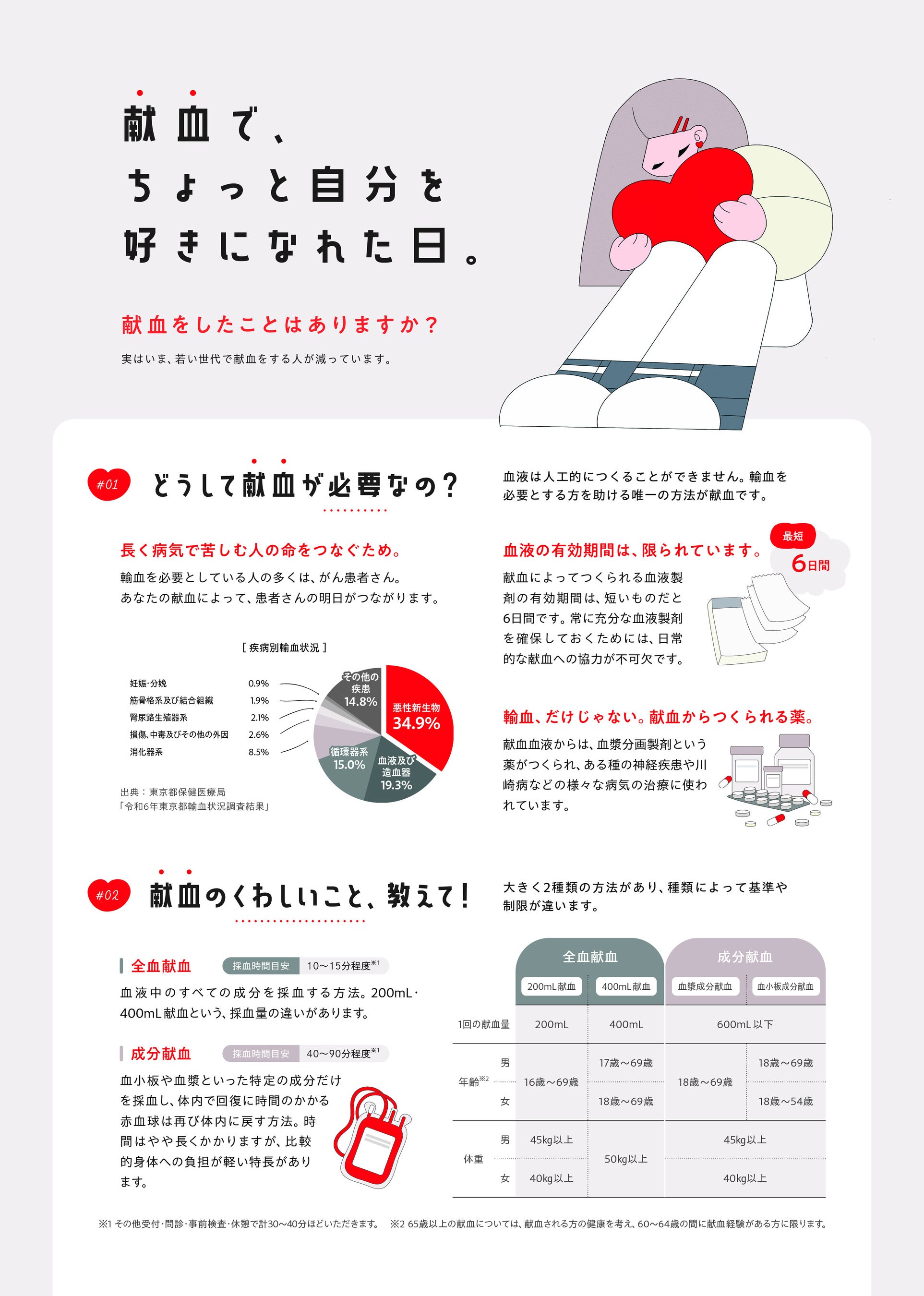 血液は人工的に造ることができず、長期間保存することもできません。病気やけがで輸血を必要としている方々に、血液製剤を安定してお届けするためには、継続的な献血へのご協力が必要です。