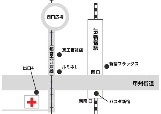 JR新宿駅南口から徒歩4分、都営新宿線・大江戸線4番口から徒歩1分とアクセス抜群です。ぜひご利用ください。