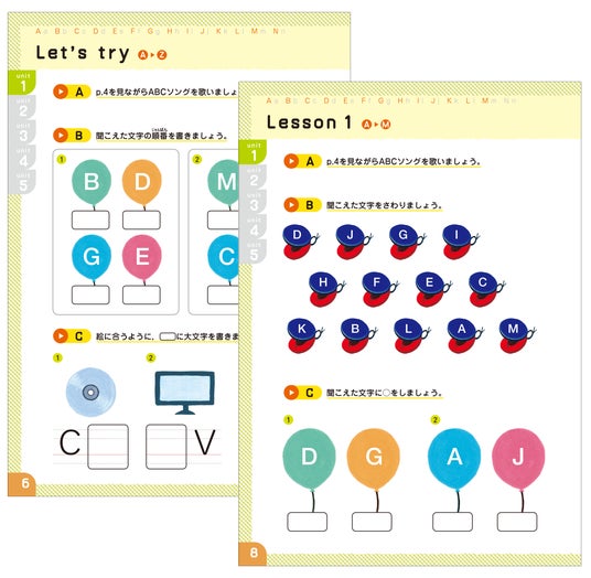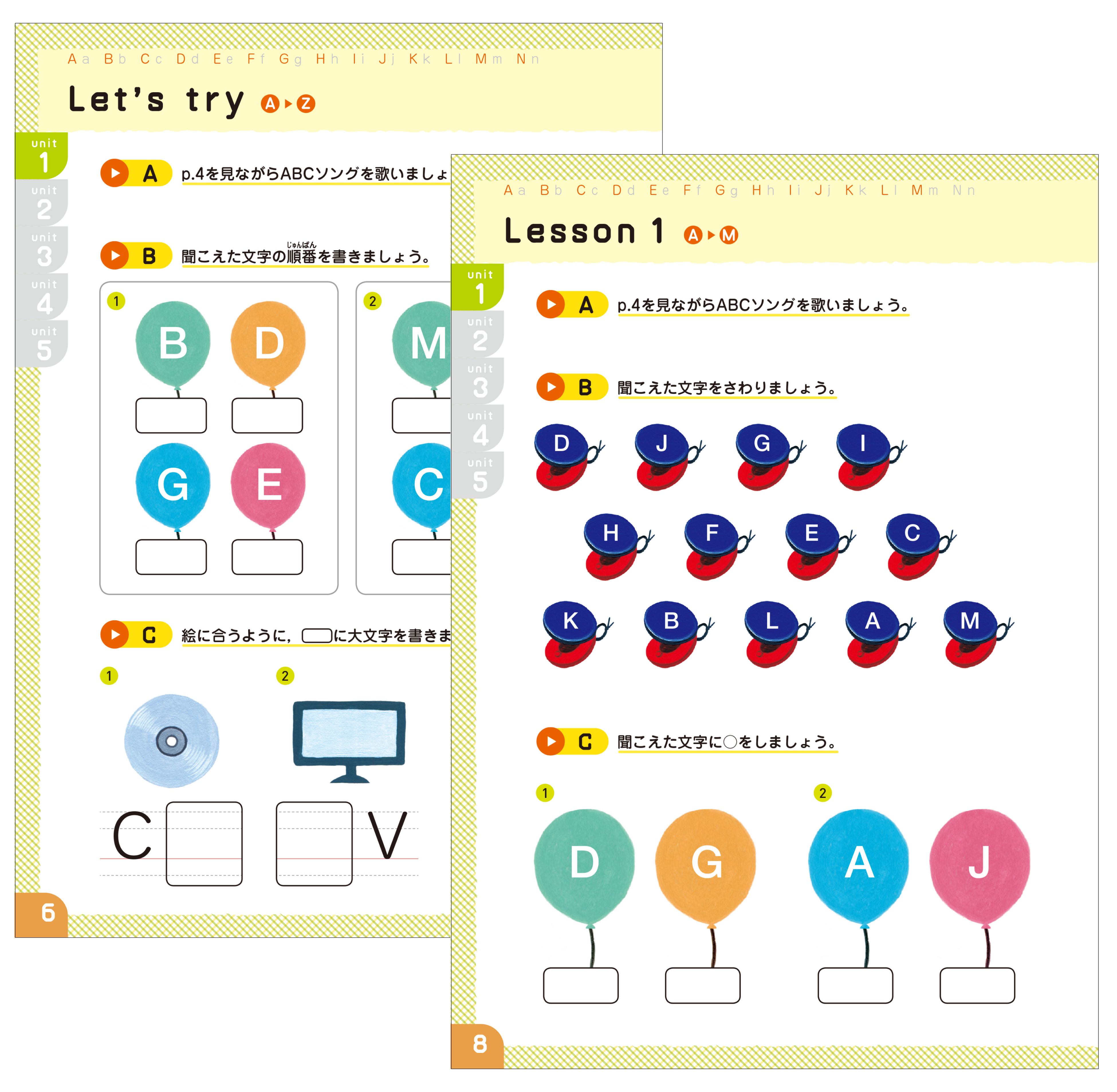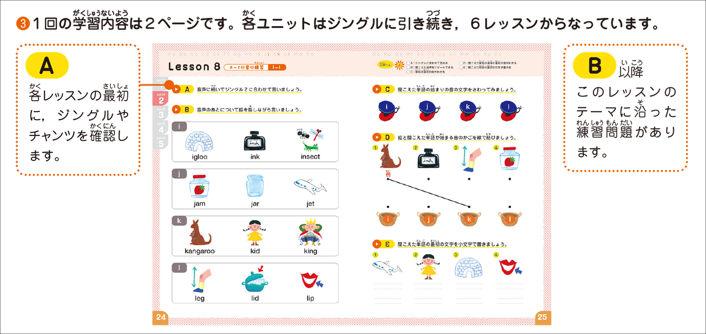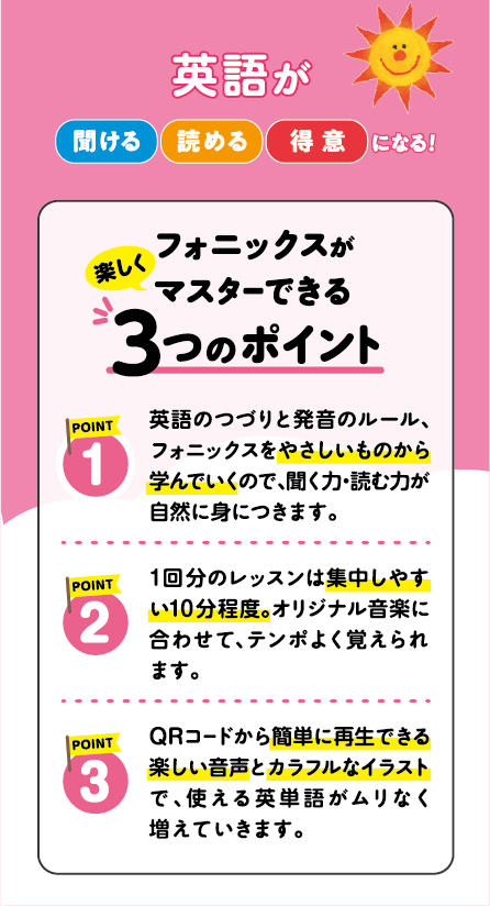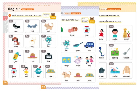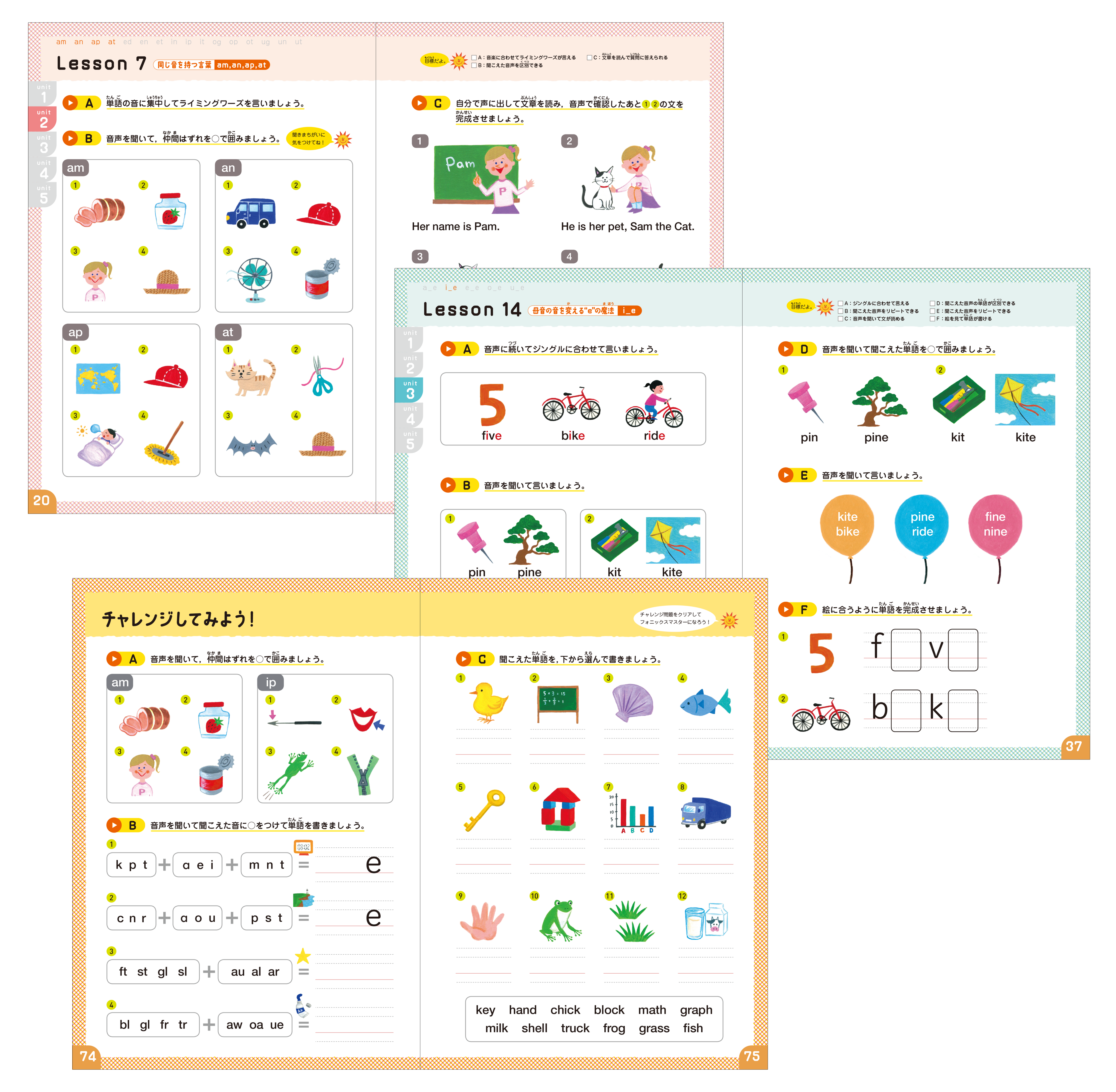 フォニックスの基本をわかりやすいルールから順を追って学んでいきます。リズミカルなオリジナル音楽に合わせてテンポよく覚えられるので、英語を学び始めた小学生はもちろん、幼児期のお子様でも楽しく進められます。