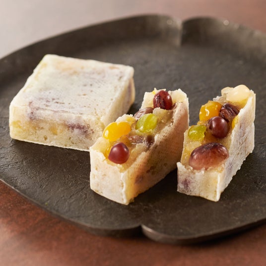古都金沢の「雅」と、宝石の「彩」をイメージし、色とりどりの豆で表現したきんつば。風味や食感が異なる5種類の豆(小豆・青えんどう・白小豆・ひよこ豆・とら豆)を組み合わせた味わいを楽しめます。