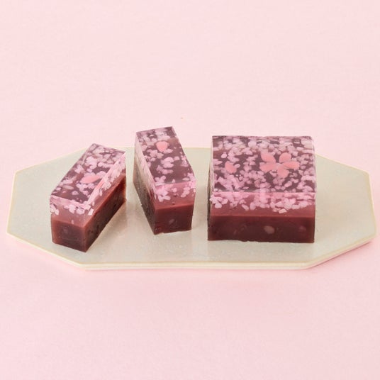 桜の花びらをかたどった⽺羹を錦⽟羹の中にちりばめ、小倉⽺羹と⼆層にした棹菓子。粒状の道明寺で夜風に舞い散る桜が表現されています。シンプルかつ上品な味わいで、美しい見た目でも楽しめます。