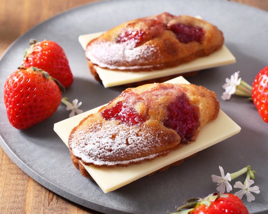 焦がしバターのコクを生かしたフィナンシェ生地に、いちごのコンフィとコンフィチュールをのせて焼き上げ、ベルギー産のホワイトチョコレートをサンドしました。いちごのフルーティな甘酸っぱさと、ホワイトチョコレートの濃厚な味わいが広がる贅沢な美味しさ。しっとりとしたフィナンシェと、パキッとした板チョコの食感のコントラストも魅力的です。