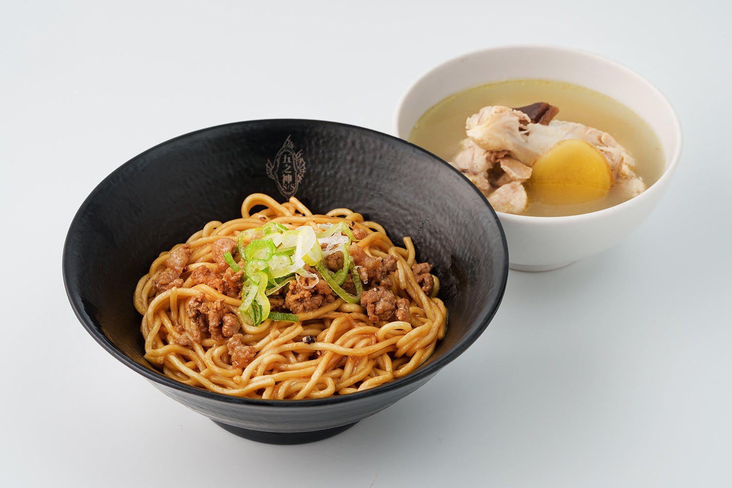 ◆麻油鶏板麺(マーヨージーバンメン) 780円海老と台湾スパイス香る「まぜぞば」に、鶏の旨味に生姜の香るスープの組み合わせ。そのまま別々に楽しむも良し、つけ麺スタイルで楽しむ良し!