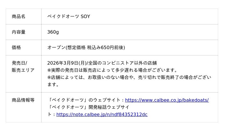 カルビー株式会社(本社:東京都千代田区、代表取締役社長兼CEO:江原 信)は、オーツ麦をこんがり焼き上げた、甘くない※1「ベイクドオーツ」より、2種類の大豆とパンプキンシードを使用した新商品『ベイクドオーツ SOY』を2026年3月9日(月)から全国のコンビニストア以外の店舗で発売します。