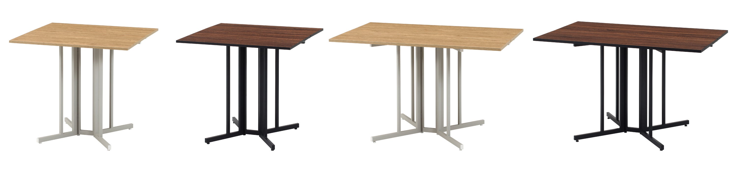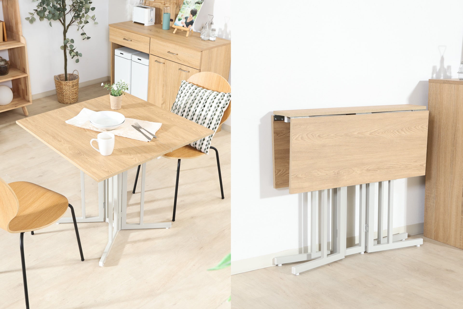 幅80/120cm×ナチュラル&ブラウン展開。普段は片側で作業、来客時は両側広げてダイニングに、使わない時はスリム収納。