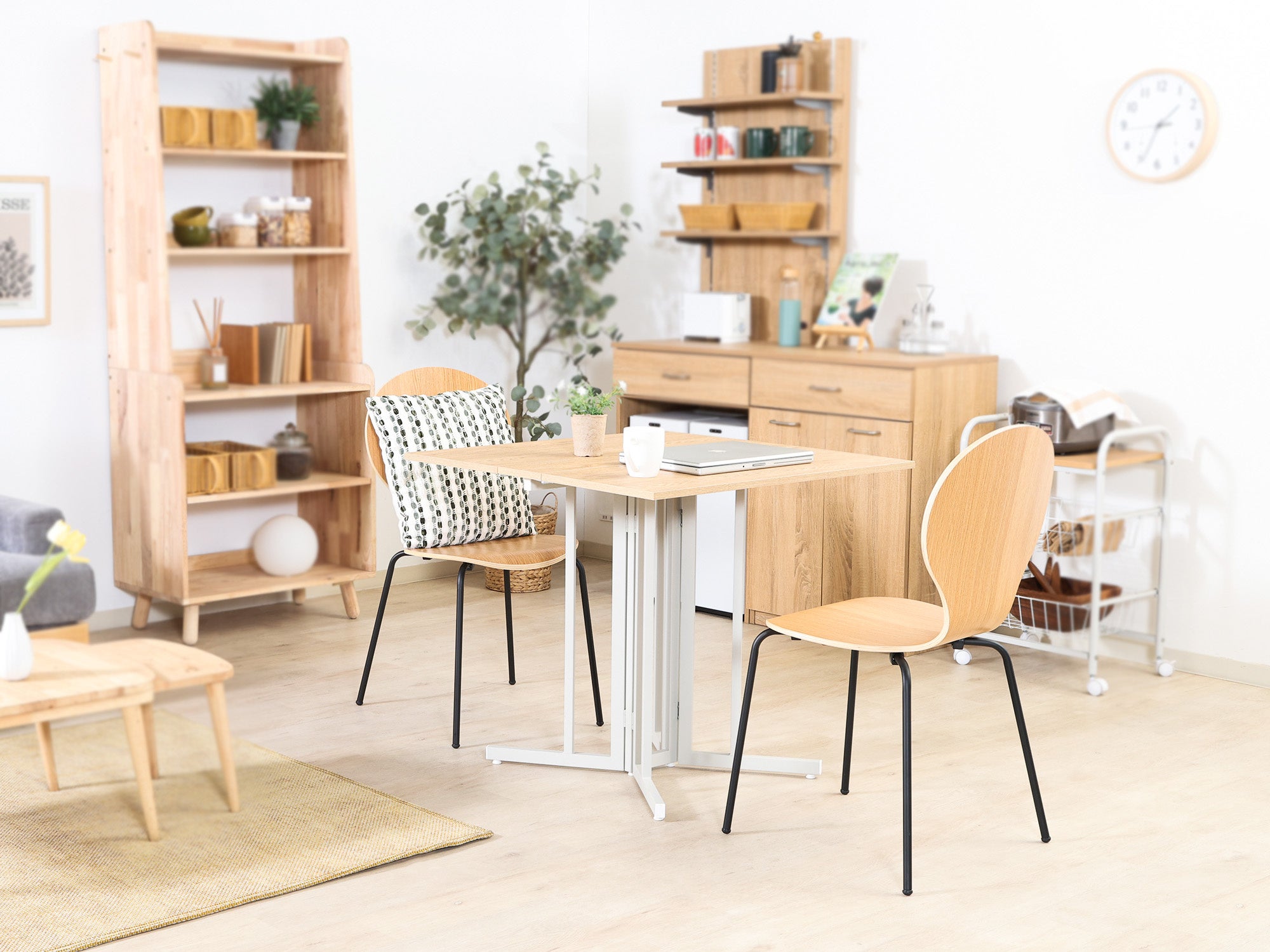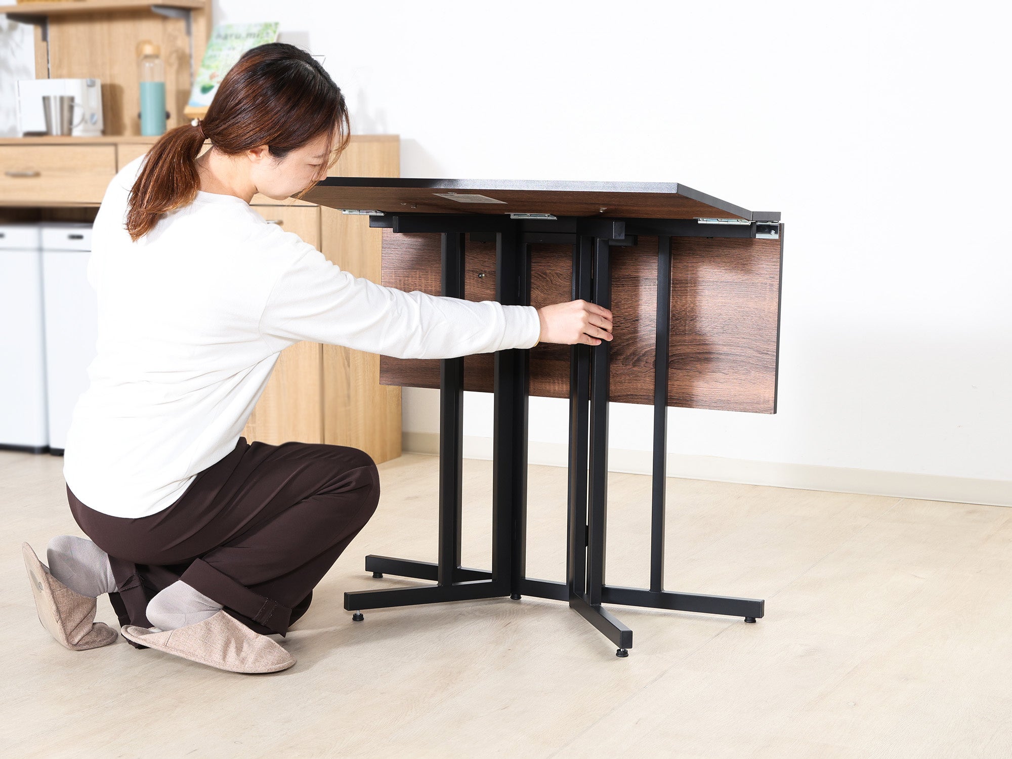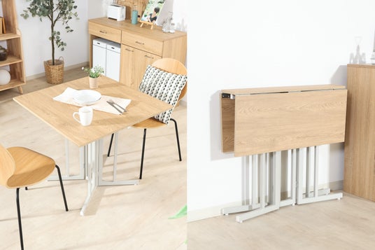 天板をパタッと広げるだけで簡単にセット完了。女性一人でも扱いやすく、毎日の出し入れもストレスフリーです。使用後は折りたたんでコンパクトに収納でき、ワンルームや省スペースのお部屋でも場所を取りません。