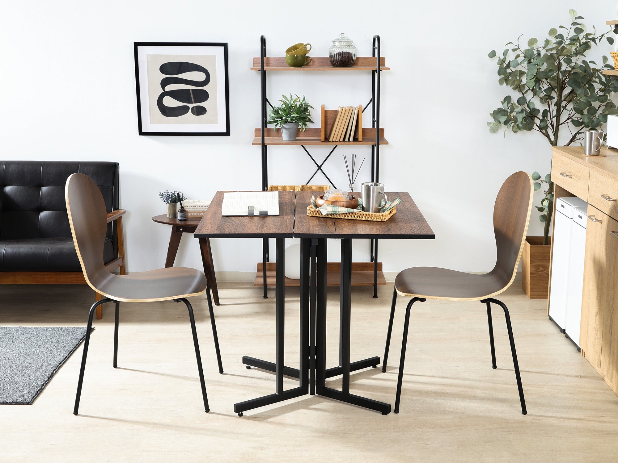 幅80×80cmのコンパクトサイズ。ワンルームやリビングの一角にも収まりやすく、2人での食事や作業にも十分な広さです。
