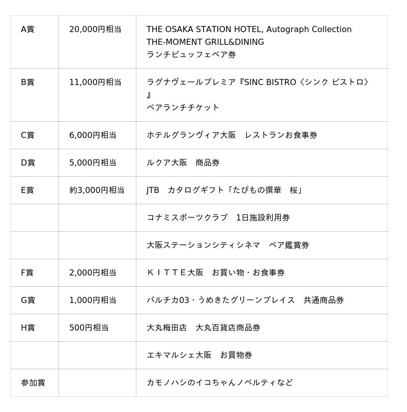 [参加条件]対象期間中に大阪ステーションシティ内店舗等で発行された100円(税込)以上のレシート1枚につき1回(1コンテンツにつき1回まで)