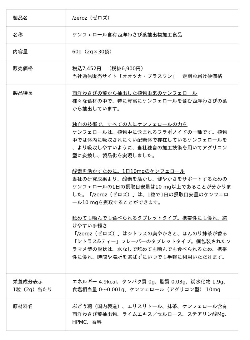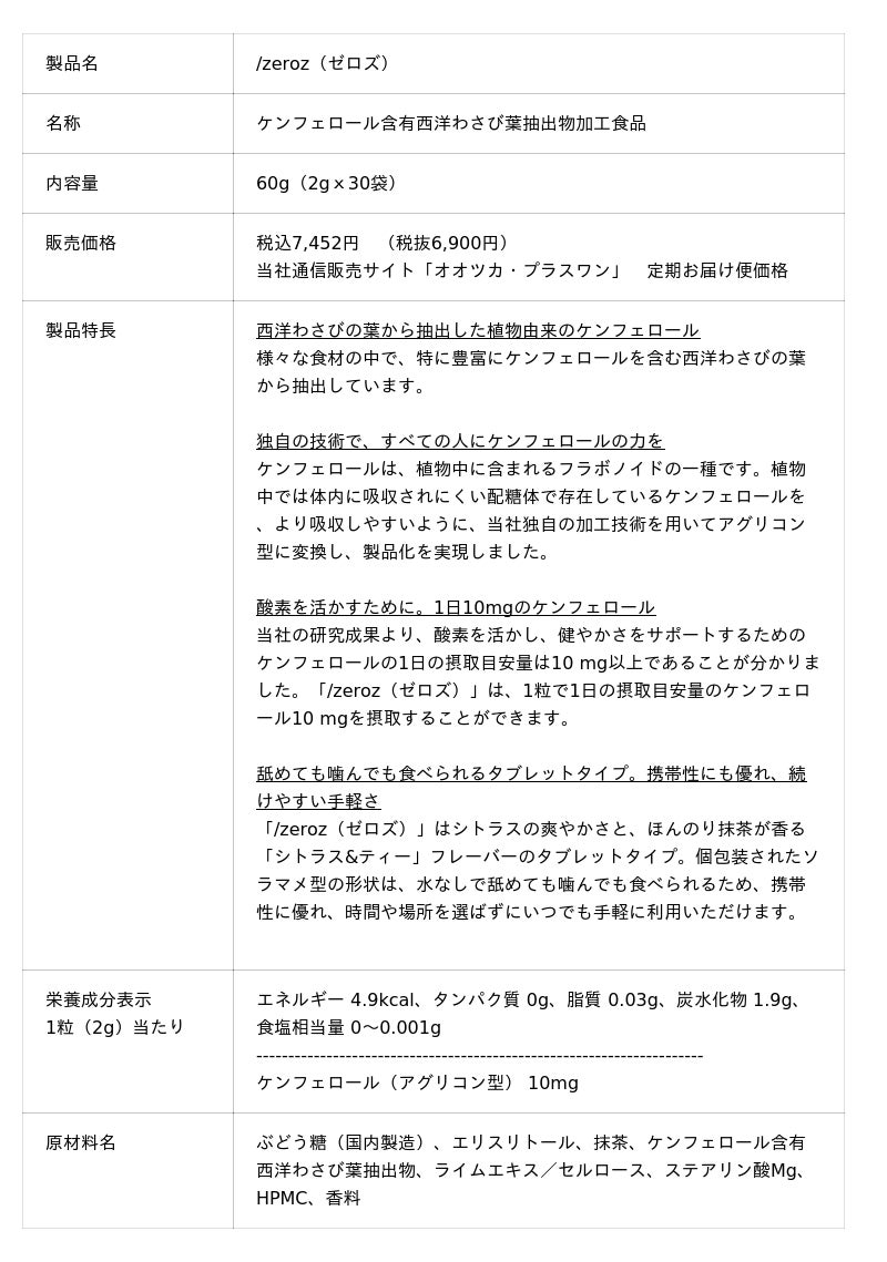 大塚製薬株式会社(本社:東京都、代表取締役社長 井上 眞、以下「大塚製薬」)は、人々の生命活動に欠かせない「酸素」に着目し、セルフコンディショニングフード「/zeroz(ゼロズ)」を開発しました。「/zeroz(ゼロズ)」は体内の酸素を活かす植物由来成分「ケンフェロール」を含有しており、身体本来の力に働きかける “Active Inner Resource”というコンセプトのもと誕生した製品です。シトラスの爽やかさと、ほんのり抹茶が香る「シトラス&ティー」フレーバーの水なしで舐めても噛んでも食べられるタブレットタイプ。1粒で1日の摂取目安量のケンフェロール10 mgを摂取することができます。