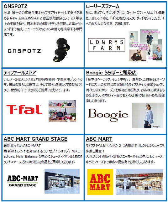 関西初出店かつ新業態となる「アディダス ストア by ABC-MART」や、大阪初出店の「茶薫小籠包」といった話題性のあるテナントに加え、飲食店舗の刷新や、男性・女性それぞれのニーズに応えるアパレル・雑貨・スポーツ系店舗を取りそろえた注目の22店舗が新たに加わります。また、「WORKMAN Plus」が「Workman Colors」の新業態へ生まれ変わる他、既存店舗の「ミスタードーナツ」、「トーマスステーション/namco」なども装いを新たに進化。家族連れをはじめ、さまざまな来館者が楽しめるラインアップがさらに充実します。