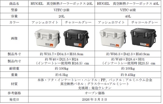 アイリスオーヤマ株式会社(本社:宮城県仙台市、代表取締役社長:大山 晃弘)は、アウトドアブランド「HUGEL(ヒューゲル)」の新商品として、20Lは最大約7日間(※1)、40Lは最大約14日間(※1)の高い保冷力を実現した「HUGEL 真空断熱クーラーボックス20L/40L」を2026年3月3日よりインターネットサイトを中心に、全国のホームセンターやアウトドア専門店などで順次発売(※2)します。