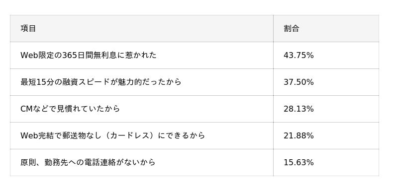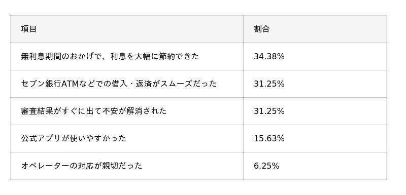 - レイクを選んだ決め手として「Web限定の無利息期間」が43.75%で最多。実際の利用者からも「無利息期間のおかげで利息を大幅に節約できた(34.38%)」と満足する声が多く、コスト面でのメリットが非常に高く評価されている。
