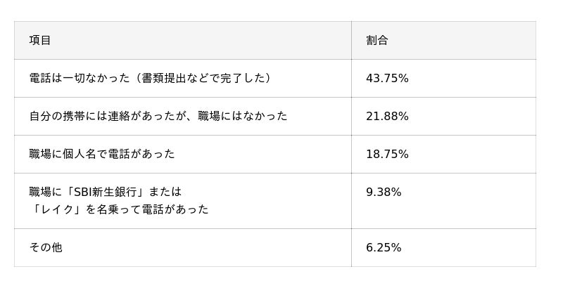 - 合計で約56%の人が「1時間以内」にお金を手にできており、迅速な対応が満足度に直結している。懸念されがちな在籍確認も、43.75%が「電話は一切なかった(書類提出などで完了)」と回答しており、周囲に知られずスムーズに借りたいというニーズに応える実態が明らかになった。