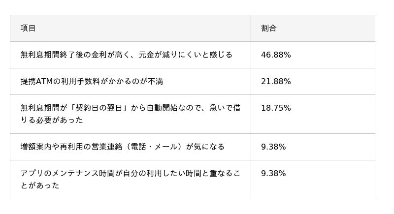 - 実際に利用したからこそわかる課題として、約47%の人が「無利息期間終了後の金利」を挙げており、無利息期間が好評な一方で、その後の返済における金利負担を感じてしまう傾向がうかがえる。