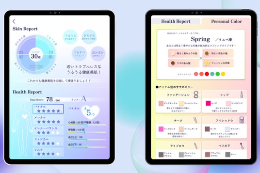30秒の動画を撮影するだけで、心拍数・呼吸数・血圧をはじめとする23項目の健康指数に加え、肌の水分量・油分量、赤みやシワ、肌年齢などの肌状態を同時に高精度で解析・表示できるアプリケーションです。美容・健康商材を取り扱う店舗や、ジム・温浴施設など、幅広い健康増進の現場で導入が進んでいます。