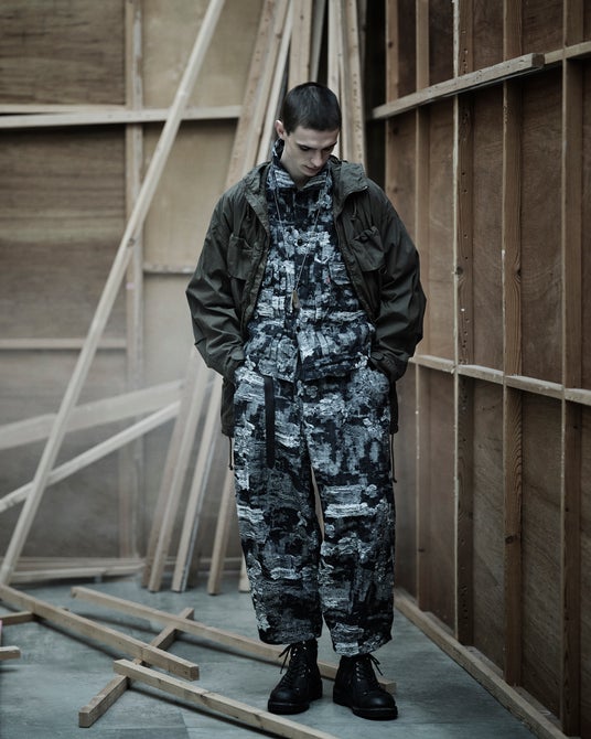 アウターとして着たマウンテンパーカーはポケットが随所に配置されており、実用性とファッション性を兼ね備えた一枚。フラワーモチーフの総柄デニムブルゾンはEDWINとのコラボレーション。胸ポケットにはEDWINの赤タブがあしらわれている。S’YTEらしい総柄使いのアイテムをメインに打ち出したカジュアルスタイル。