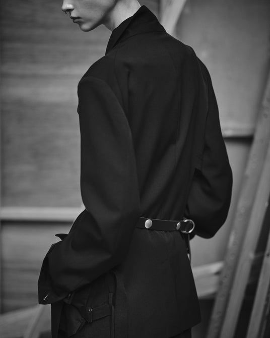 ウエストマークしたコンチョベルトや、ファスナーモチーフのアクセサリーがアクセントになったオールブラックのコーディネート。定番素材のウールギャバジンのセットアップは、そのデザインや立体的なプリーツで視覚的違和感を楽しむことができる。