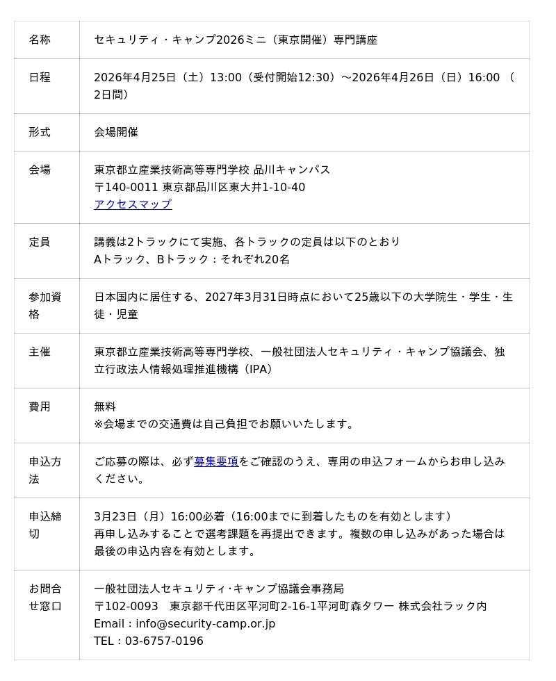 イベント詳細:https://www.security-camp.or.jp/minicamp/tokyo2026.html
