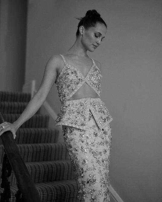 アリシア・ヴィキャンデルは、アイメイクに「LV オンブル 150 ベージュ メメント」を、リップメイクには「LV ルージュ 105 ヌード ネセセール」を合わせました。