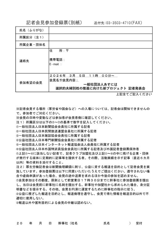 備考:厚生労働記者会非加盟の記者様もご参加いただけますが、事前申請の必要がございます。誠に恐れ入りますが、巻末の「記者会見参加登録票(別紙)」を記載の上、3月4日(水)17:30までに厚生労働記者会へFAXにてお送りいただけますよう、お願いいたします。