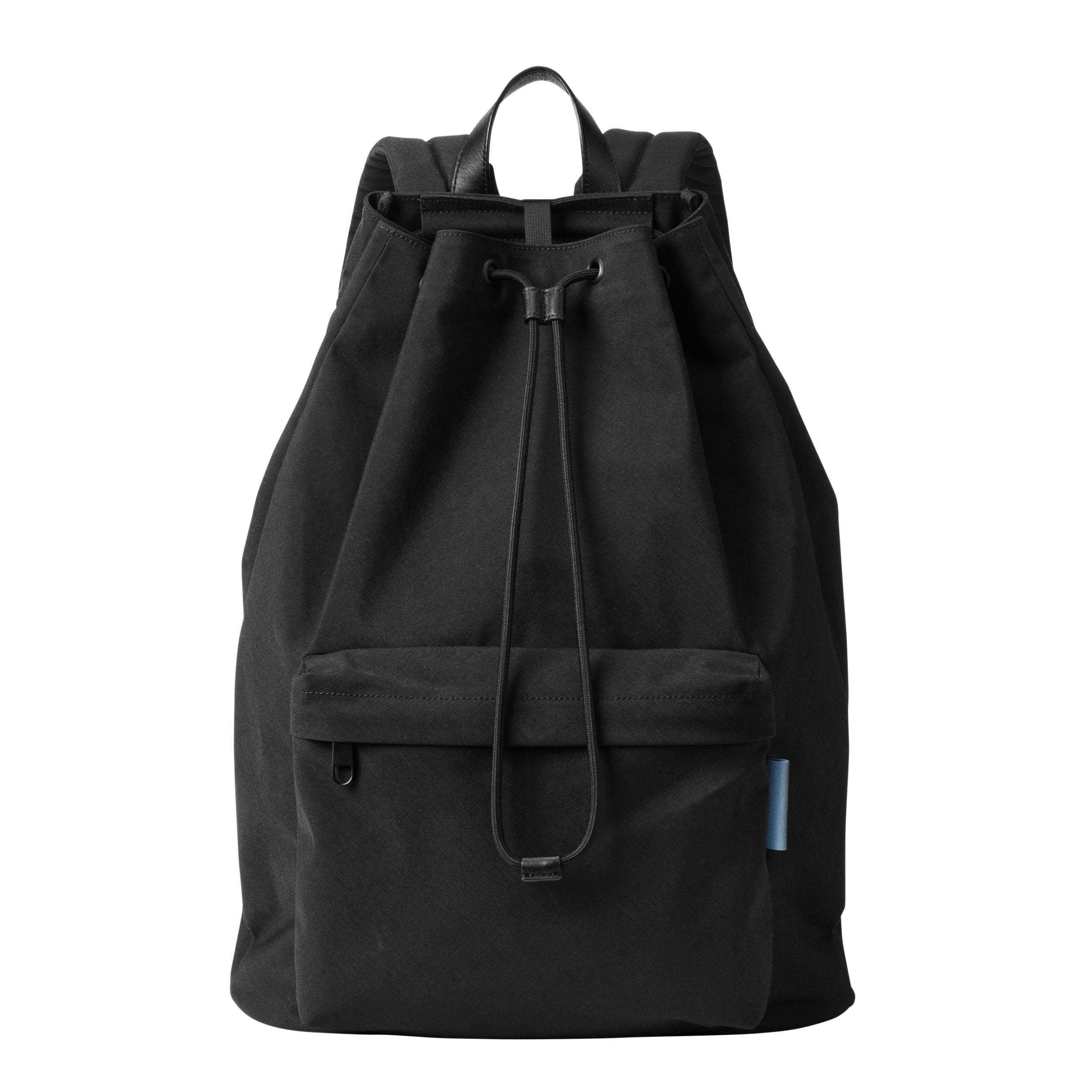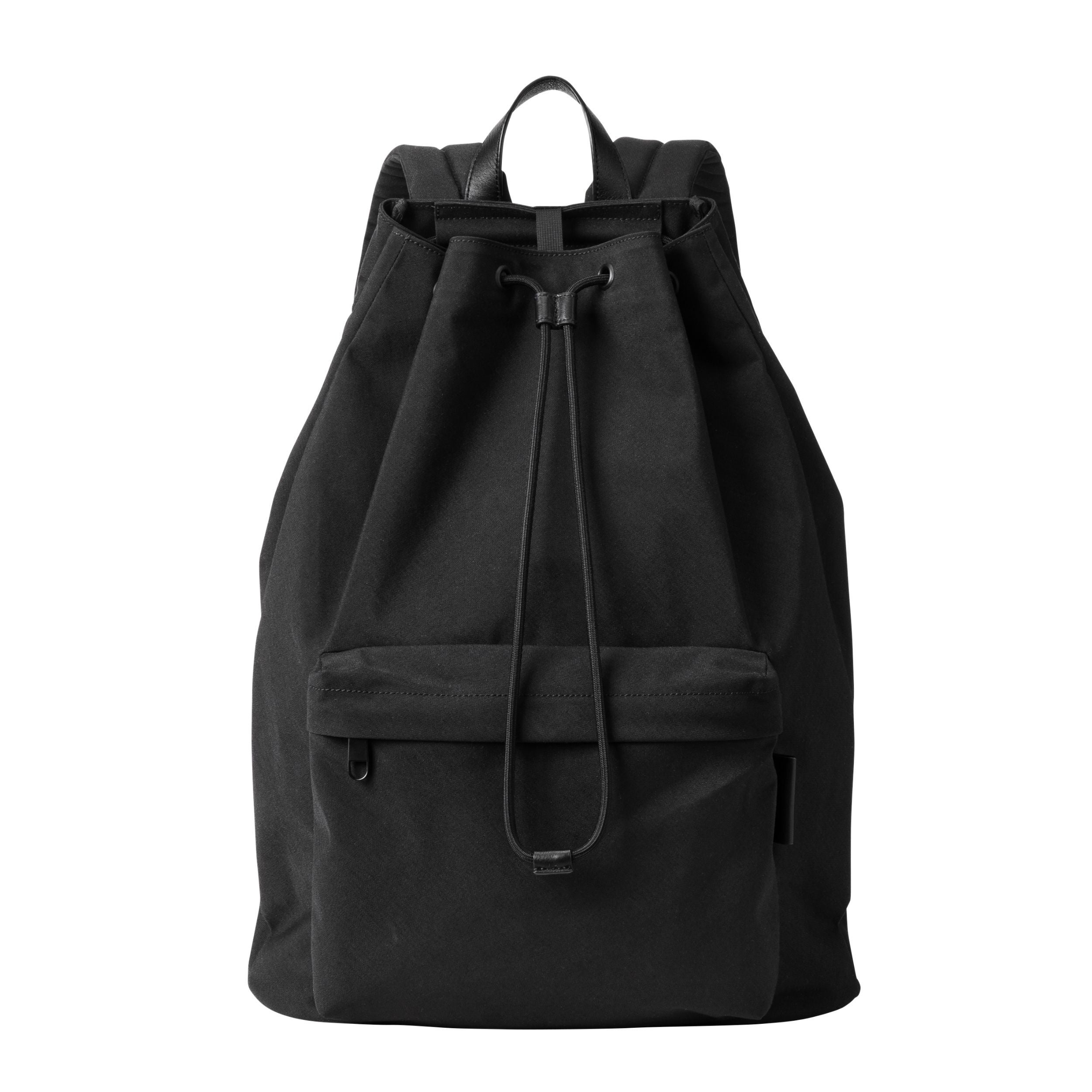 ドローストリング構造が生む柔らかなフォルムと、自然に生まれるドレープが特徴。甘さが出やすい設計を、コットンライクなナイロン素材や太めのコード、レザータグで引き締めました。デイパック型とは異なる軽やかさと抜け感を備えつつ、フロントポケットやトロリースリーブなど実用性も確保しています。