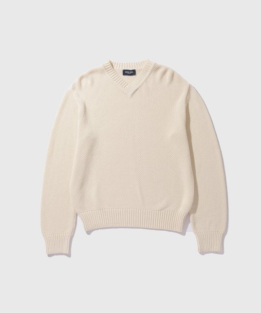 また、「ROYAL MER」のアーカイブより、point de ble(麦の穂編み)という意味をもつ、立体感があり、クラシックかつ上品な印象の編地の模様を、吸湿性や通気性に優れた、マーセライズコットンで独特のハリを出してアレンジした一着です。