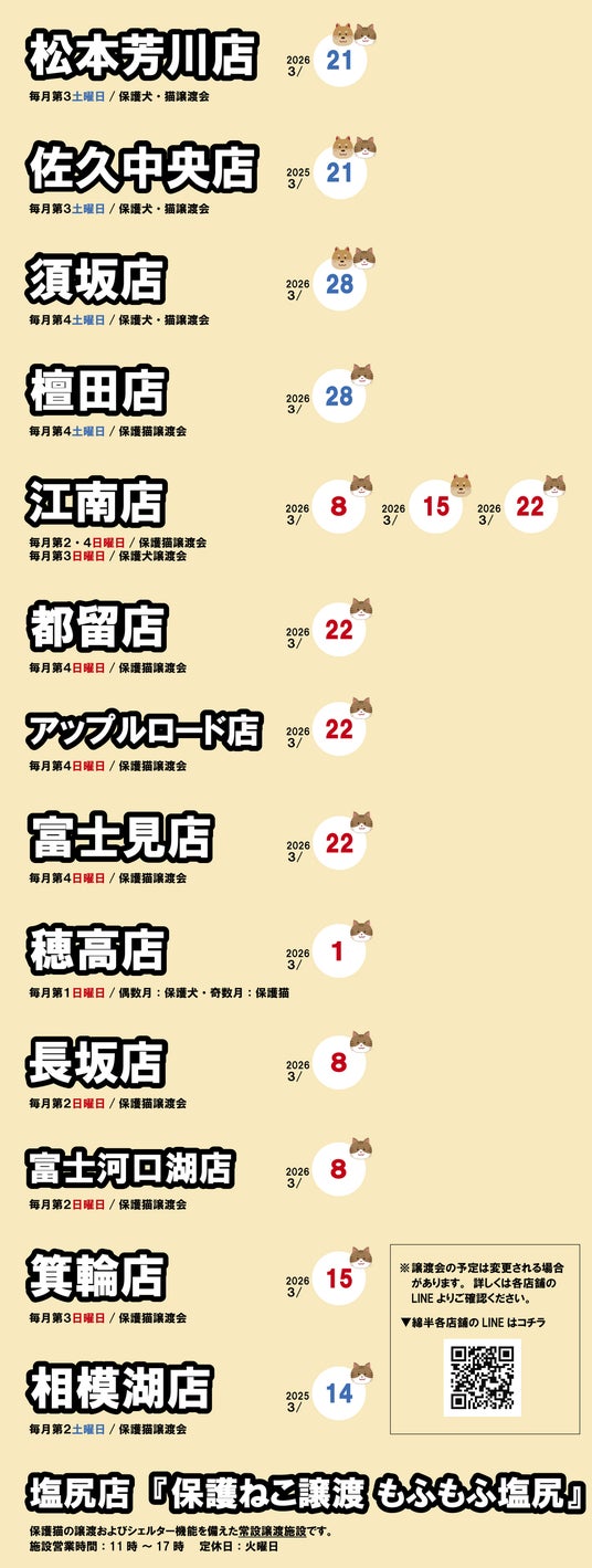 綿半パートナーズ株式会社(長野県飯田市 代表取締役社長:野原佳代子)はこの度、長野・山梨・愛知・神奈川の綿半店舗にて保護犬・保護猫の譲渡会を実施します。