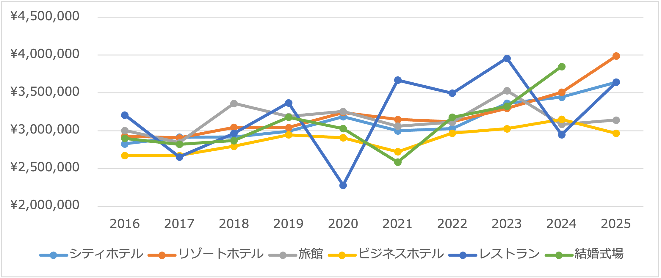 続いて求人施設を業態カテゴリごとに分類し、それぞれの採用時給与の推移を分析しました。集計対象となった求人企業を「シティホテル」「リゾートホテル」「旅館」「ビジネスホテル」「レストラン」「結婚式場」の6カテゴリに区分しています(※2025年は結婚式場の採用データなし)。各カテゴリの給与傾向には、業態ごとの特徴が見られました。