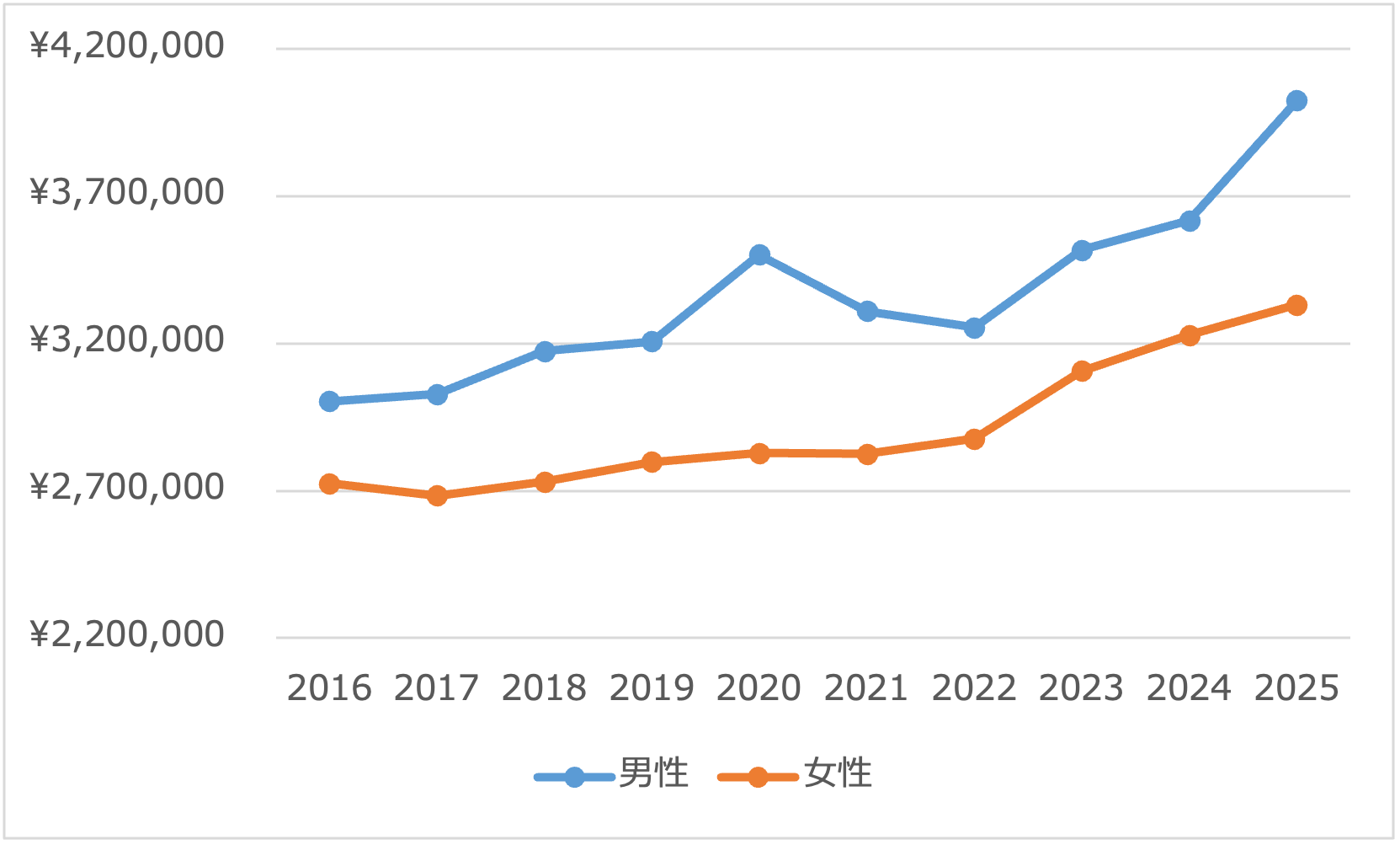 最後に、採用時給与を男女別に分類し、その推移を分析しました。男女別の提示年収水準を見ると、期間を通じて一定の差が確認される一方で、近年の変化には注目すべき動きも見られます。