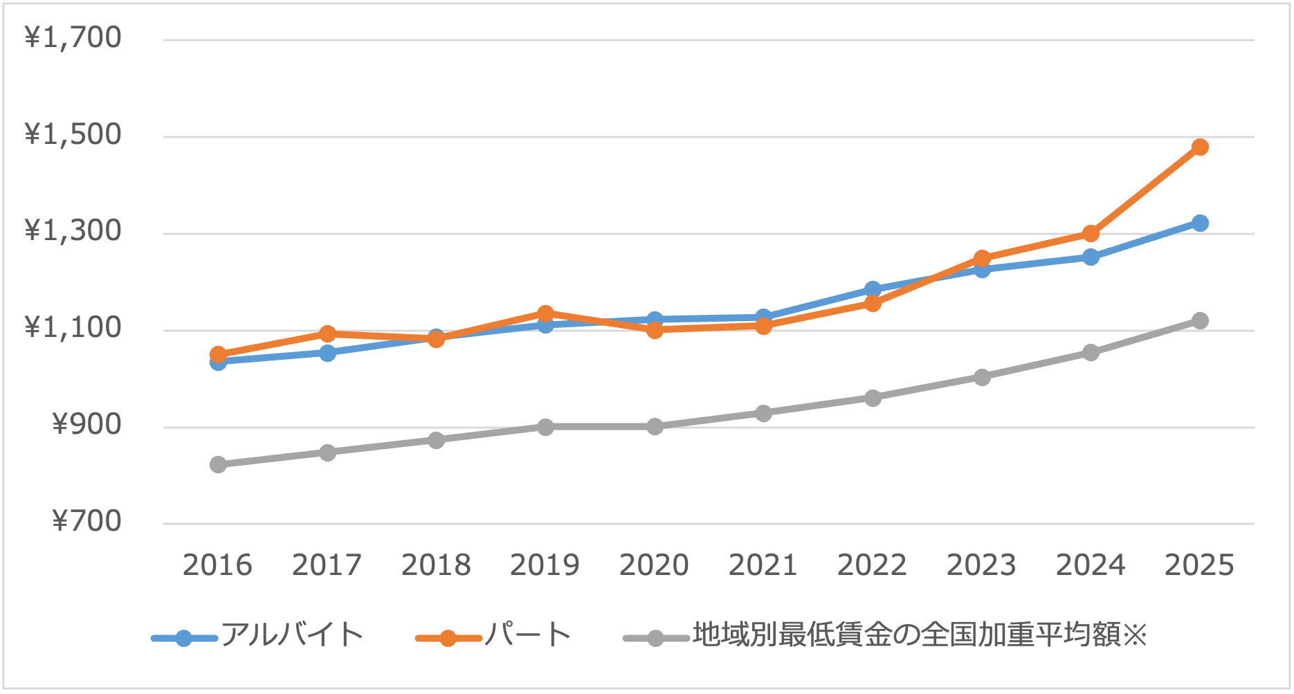 このような動きは、制度的要因に加えて、企業側の採用条件設計や人材確保環境の変化が影響している可能性を示唆しています。アルバイトとパートで異なる変動特性が見られる点も示唆的であり、雇用形態の違いというより、職務内容や期待役割の差異が反映されていることも考えられます。結果として、時給水準の変化は賃金動向であると同時に、採用市場における需給環境の変化を映し出す指標として捉えることができます。