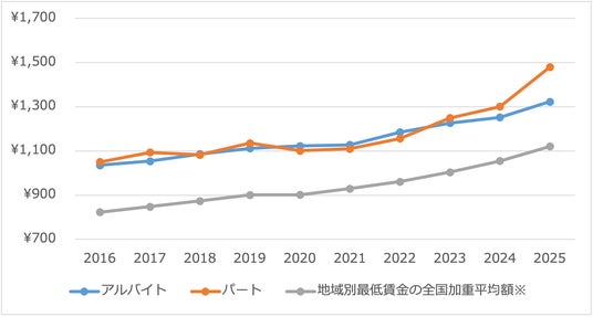 アルバイト・パート採用の時給推移を見ると、全体としては緩やかな上昇傾向を維持しています。アルバイトの平均提示時給は2016年の1,035円から2025年には1,323円へ上昇し、パートも同期間で1,051円から1,480円へ上昇しています。一方で、年度ごとの増加率には差が見られ、上昇が続く局面だけでなく、一時的な調整が観察される年度も確認されました。