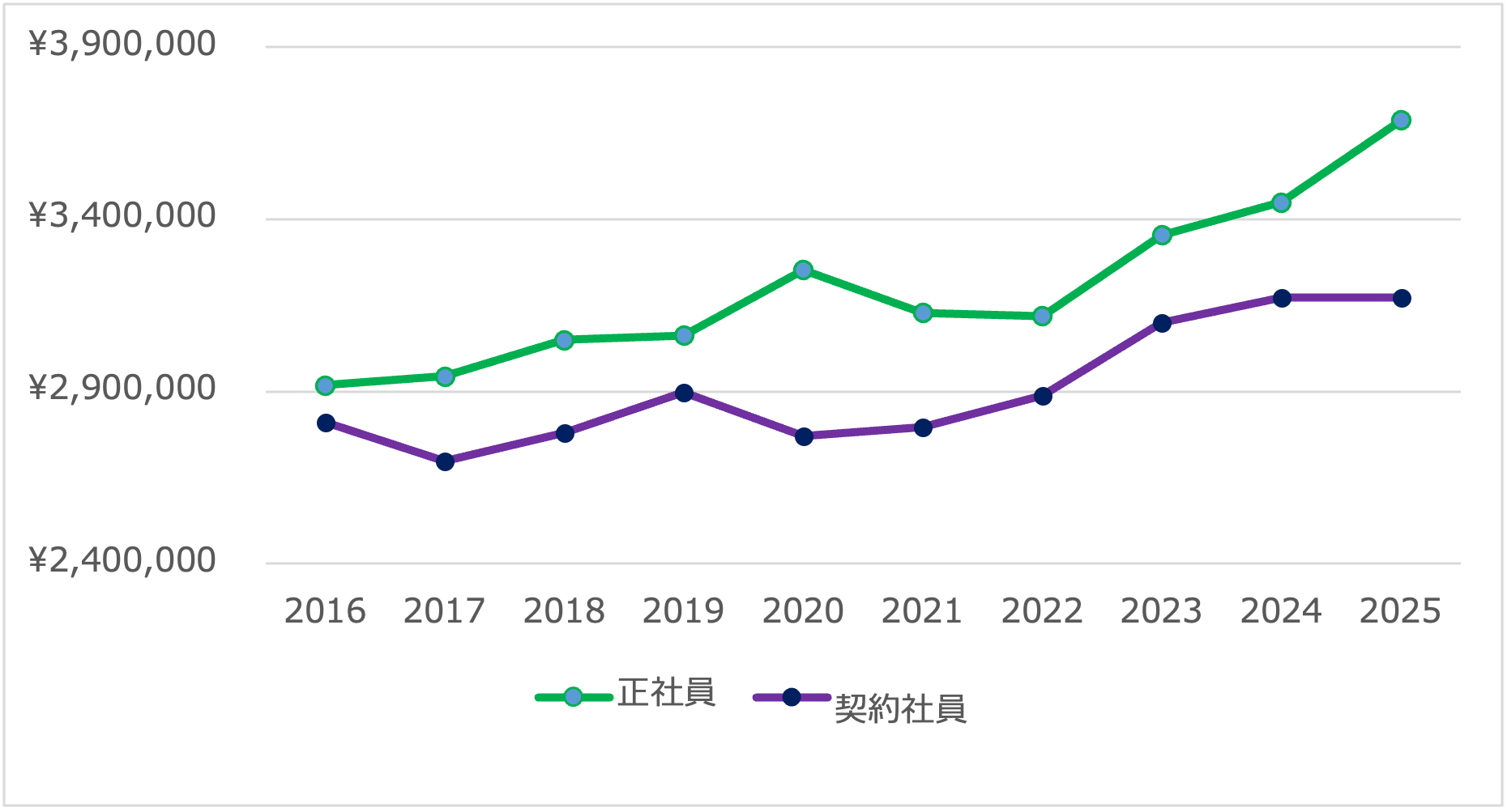 契約社員・正社員の年収推移についても、長期的には上昇基調が確認されます。正社員の平均提示年収は2016年の2,918,042円から2025年には3,689,094円へ上昇しており、契約社員も同期間で2,809,781円から3,172,875円へ上昇しています。ただし、提示年収の変動は必ずしも連続的ではなく、年度ごとの増減や調整も見られます。