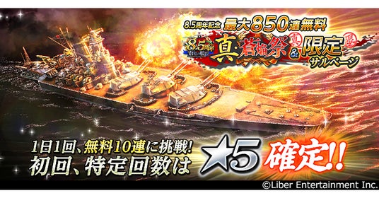 1日1回、真・蒼焔祭艦と、限定艦がピックアップされた10連サルベージに無料で挑戦できるサルベージを開催します。さらに、本サルベージは、最大で85回挑戦できるほか、初回と特定回は、★5艦が一隻以上確定となっています。