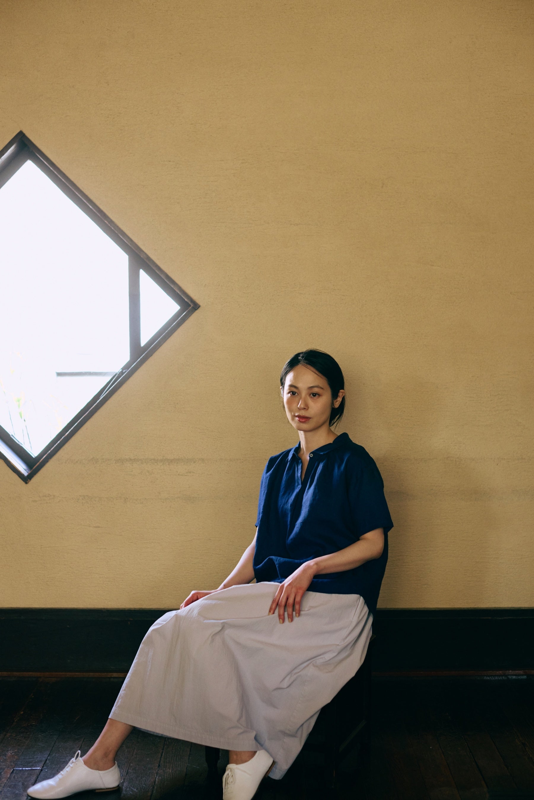 トップス:「リネンのシンプルブラウス」1万5400円(税込・3月発売予定) ボトムス:「ガーメントダイギャザースカート」 1万9800円(税込・3月発売予定)