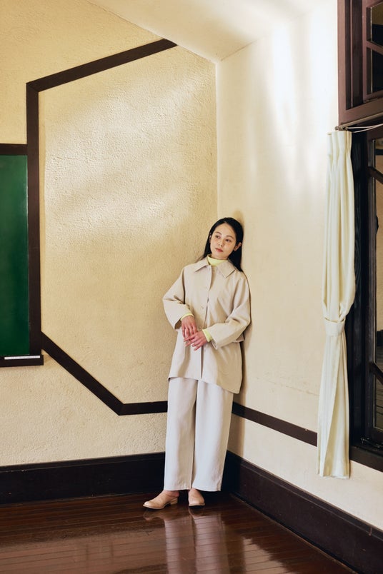 ジャケット:「ポリエステルのコルジャケット」 2万4200円(税込・2月発売予定) 中に着たカットソー:「コットンフライスハイネックプルオーバー」9900円(税込・2月発売予定) ボトムス:「ポリエステルリングドットパンツ」2万3100円(税込・2月発売予定)