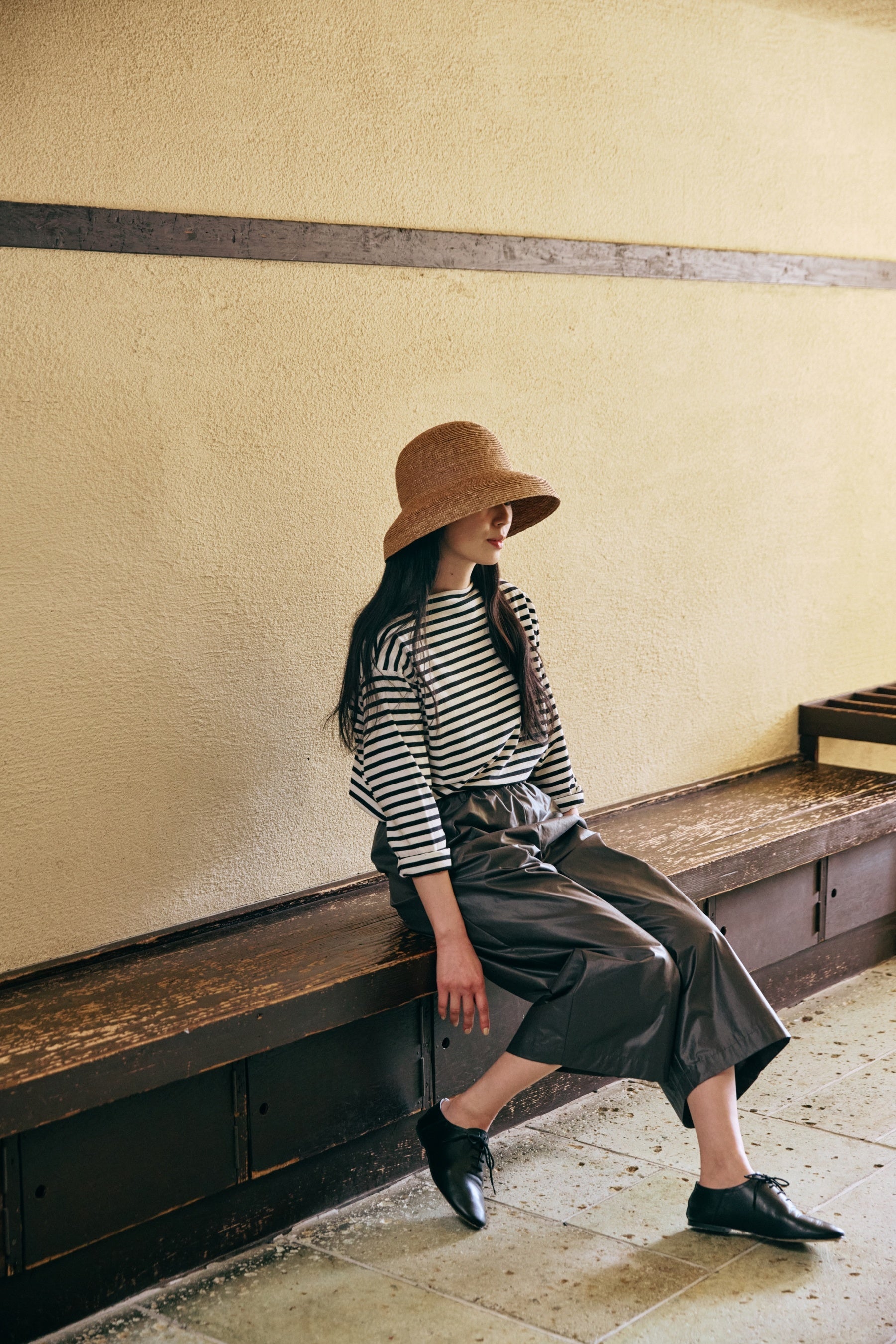 トップス:「ハイゲージコットンボーダーTシャツ」8800円(税込) ボトムス:「ポリエステルコットンのワイドクロップドパンツ」1万8700円(税込・4月発売予定) 帽子:「カサブランカ」 1万6500円(税込)