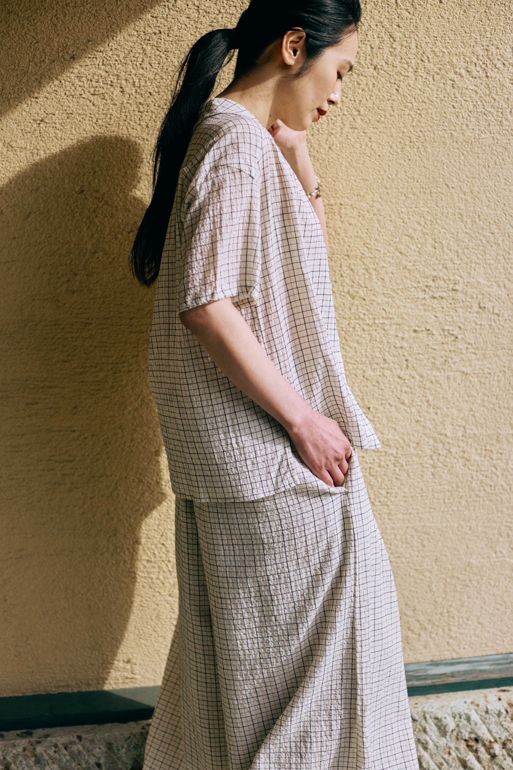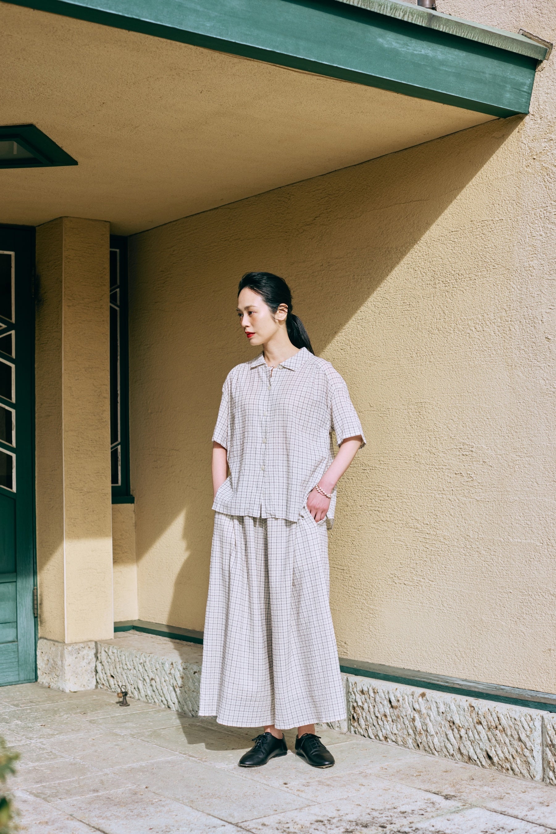 トップス:「コットンチェックショートスリーブブラウス」1万6500円(税込・5月発売予定) ボトムス:「コットンチェックキュロットワイドパンツ」2万900円(税込・5月発売予定)